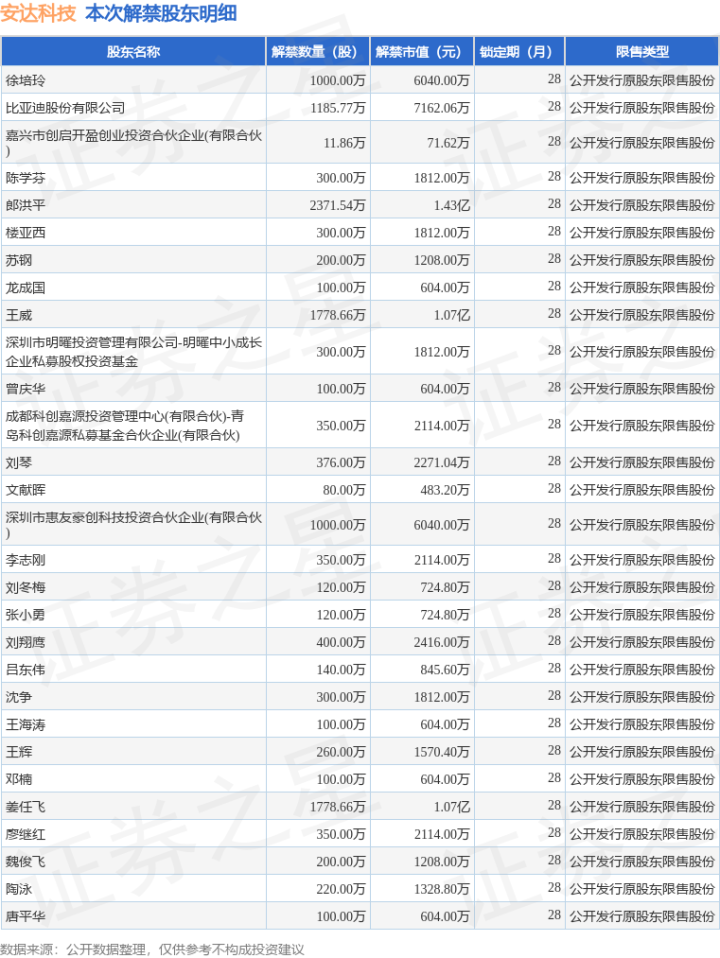 证券之星消息,根据市场公开信息整理,安达科技(830809)于7月11日将有1.4亿股限售股份解禁,为公司公开发行原股东限售股份,占公司总股本23.3%。(本次数据根据历史公告整理得出,实际情况以上市公司最新公告为准)本次解禁后,公司还有1.4亿股限售股份,占总股本23.31%。具体如下图所示: